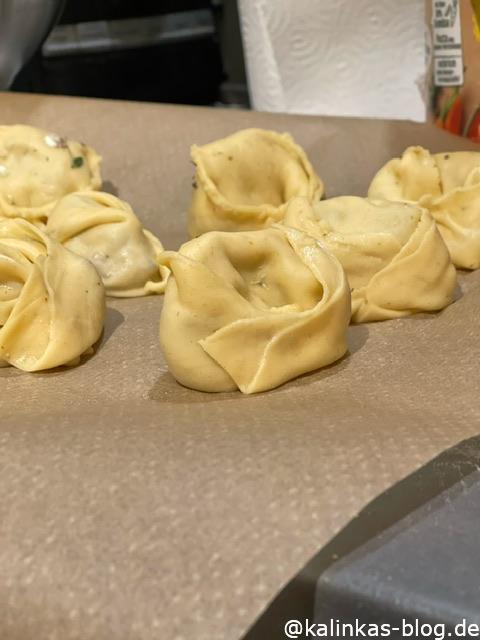 - Fertige Tortellini, parkt ihr auf einem bemehlten Stück Backpapier. Zum Kochen einfach Wasser mit etwas Salz erhitzen, und die Torteloni circa 12 Minuten kochen. Passt auf, dass das Wasser nicht zu sehr blubbert, sondern nur leicht kocht, sonst besteht die Gefahr, dass euch die Tortelloni aufgehen.