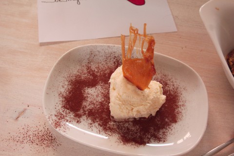 • Äpfel mit der Schnittseite nach oben in eine gebutterte Muffinform geben. Etwas Karamell in die Vertiefung geben und den Teig auflegen. Im 200 Grad heißen Backofen 20 min backen. Nach dem Backen sofort auf eine große Platte wenden und mit dem Eis servieren.