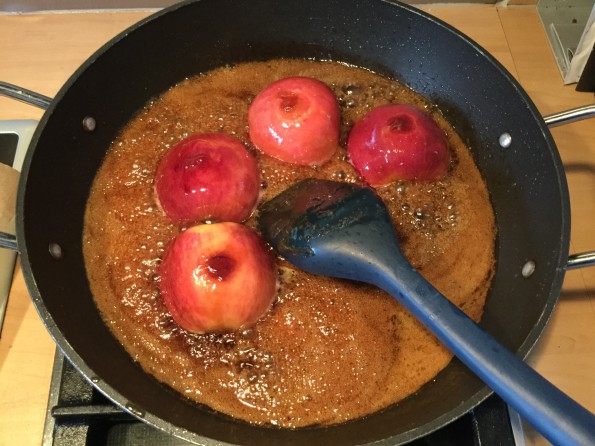 • Die Äpfel halbieren und das Kerngehäuse entfernen (geht am Besten mit einem Melonenbällchenformer). Das Isomalt in einer heißen Pfanne schmelzen und dann 4 EL Kokoszucker zugeben. Einen EL Butter zugeben und gut verrühren. Die Äpfel mit der geschnittenen Seite nach unten in den Karamell geben und die Äpfel bei gelegentlichem Wenden im heißen Karamell da. 10 min garen (Achtung, dabei bleiben da das Isomalt schnell anbrennt).
