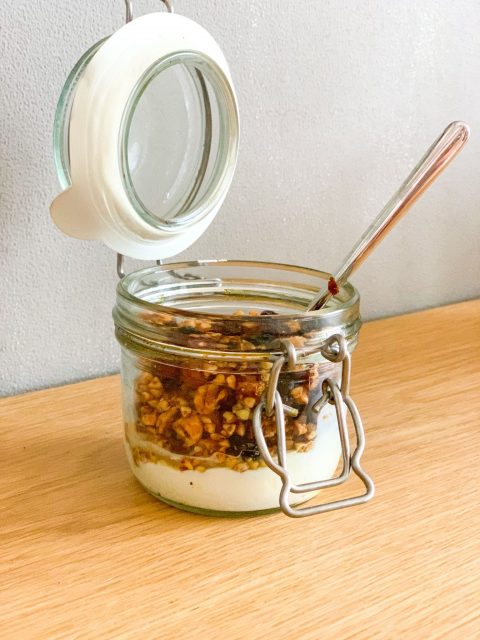 Ich bin ja kein großer Frühstücker, nehme aber gerne zum Mittagessen Joghurt und Müsli mit. Das lässt sich wunderbar vorbereiten und in kleinen Gläschen im Bürokühlschrank verstauen. Früher habe ich immer glutenfreies und zuckerfreies Müsli gekauft, seitdem ich mich mit der Sirtfood-Diät beschäftige habe ich viele tolle Anregungen für selbstgemachtes Granola gefunden.