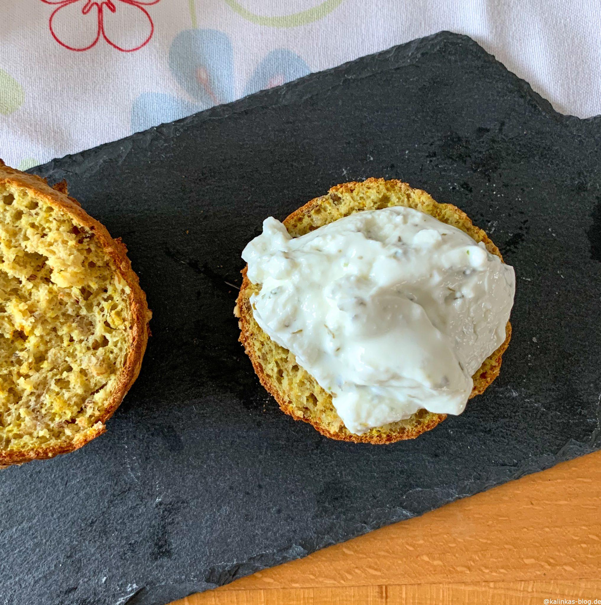 Die Basis für das Rezept sind die Skyr-Brötchen die ich euch schon mal vorgestellt habe. Die Brötchen sind auf der Basis von Buchweizenmehl und glutenfreien Haferflocken, durch den vielen verwendeten Joghurt sind sie deutlich Kohlenhydrat ärmer als normale Brötchen. Ihr kennt diese Rezepte ja aus der Wölkchen Bäckerei. Ich habe auch noch etwas Kurkuma hinzugegeben, das ergibt zum einen eine sehr schöne Farbe zum anderen haben wir so noch ein zusätzliches Sirt.