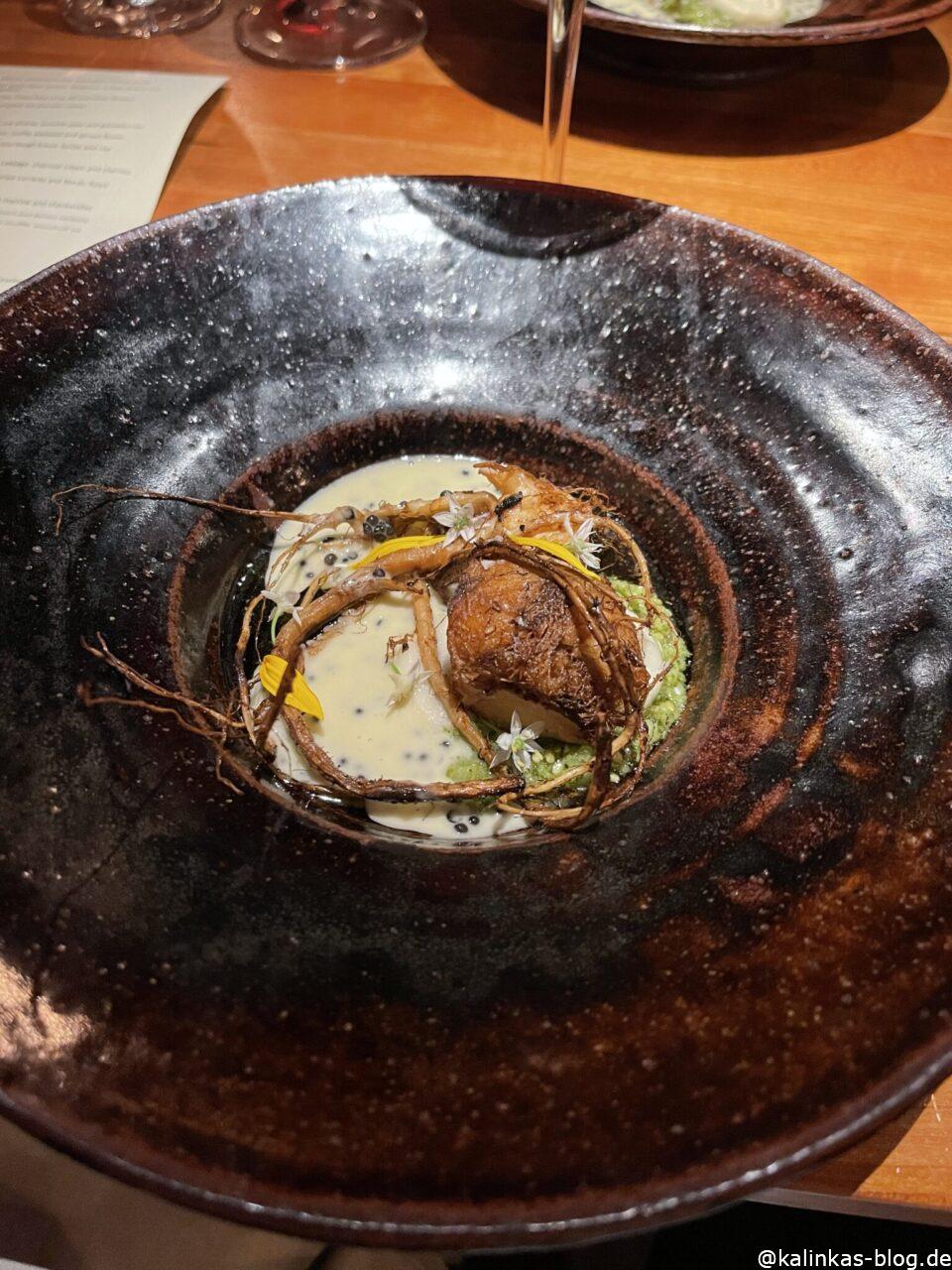 Die einzelnen Gänge hatten wir mit der Weinbegleitung gebucht. Auch hier gab es ungewöhnliche Weine, z.B. einen ungarischen Orange-Wein oder einen italienischen Pet. Nat den ich so im Laden wahrscheinlich nicht gekauft hätte.