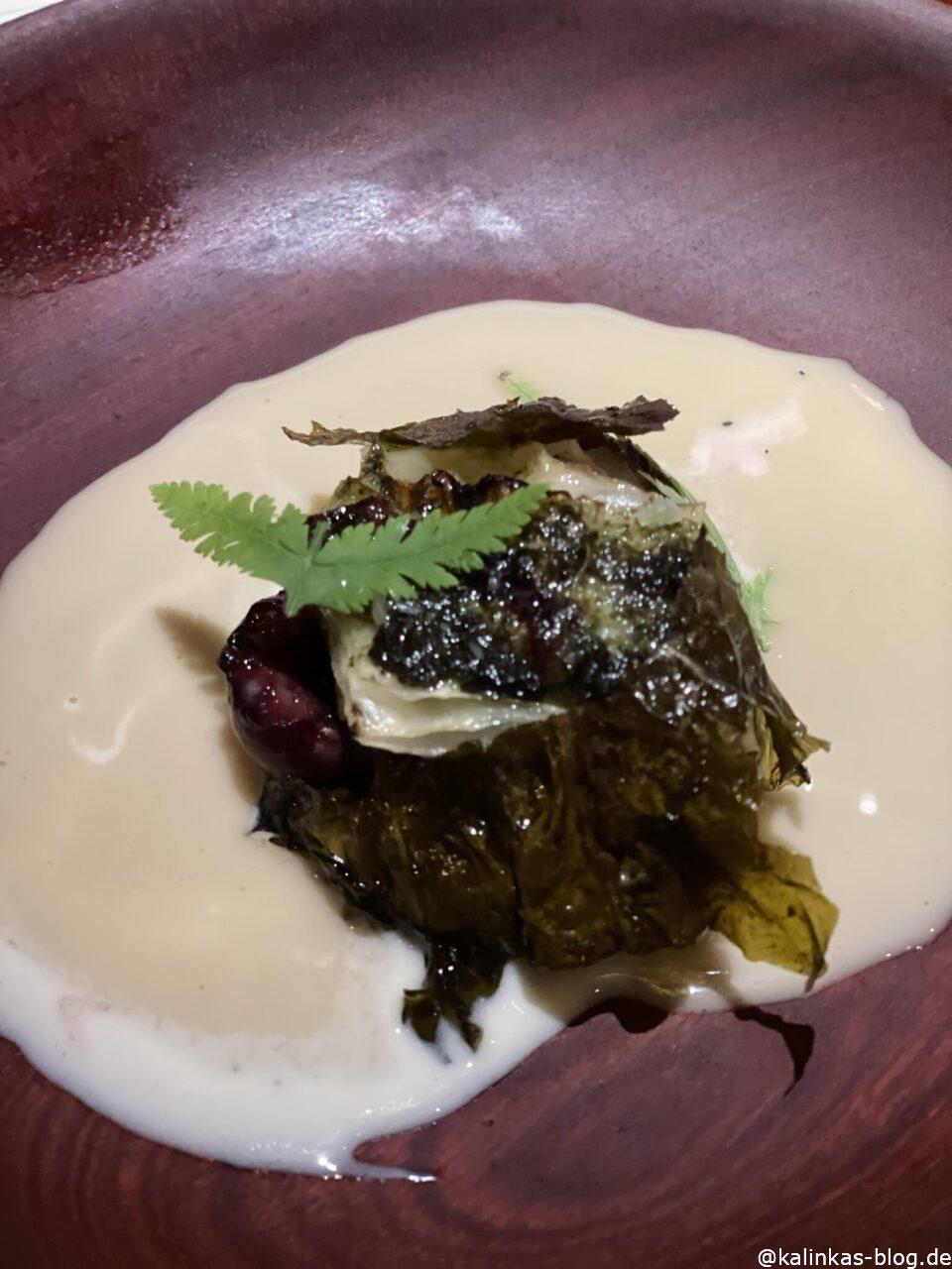 Mein absoluter Höhepunkt im Menü war eine Kombi aus einem Steinpilz-Soufflee mit Waldmeistereis und Blaubeeren. Das klingt extrem merkwürdig, das erdige Aroma des Steinpilzes hat aber durch die Frische des Waldmeistes so einen wunderbaren Gesamtgeschmack ergeben – alleine dafür würde ich das komplette Menü nochmal essen.