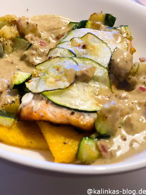- Zum Anrichten unten auf den Teller die Polenta geben, darauf den Lachs. An die Seite kommt die gewürfelte Zucchini und darauf dann Soße.... und wahrscheinlich sieht das bei euch wieder schöner aus als bei Mir 🙂