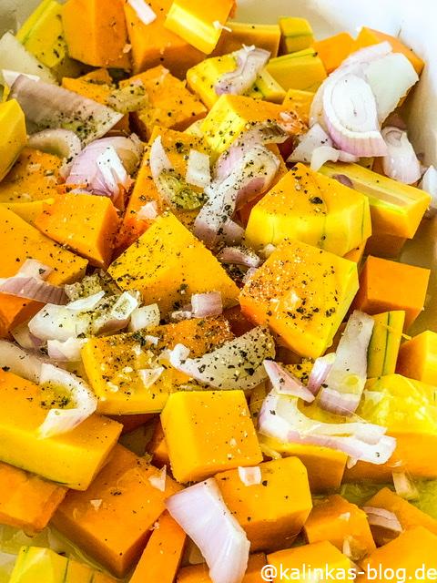 - Den Backofen auf 180 Grad Umluft vorheizen. Den Kürbis schälen, entkernen und in mundgerechte Stücke schneiden. Etwas Öl in eine Auflaufform geben und den Kürbis hineingeben. Die Zwiebel schälen, grob würfeln und auf dem Kürbis verteilen. Alles mit Olivenöl beträufeln und salzen und pfeffern. Für 40 min backen, zwischendurch 1 x vorsichtig umrühren.