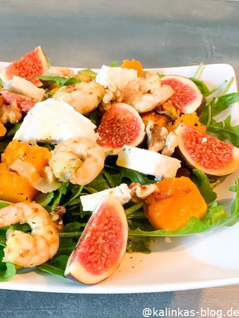 - Zum Anrichten den Rucola in einer separaten Schüssel mit der Hälfte des Dressings mischen und unten auf den Teller geben. Den Kürbis-Zwiebel-Mix auf dem Salat verteilen. Feigen und Nüsse dazugeben. Den Ziegenkäse drüberstreuseln und die Garnelen drübergeben, zum Schluss die restliche Vinaigrette darauf träufeln.