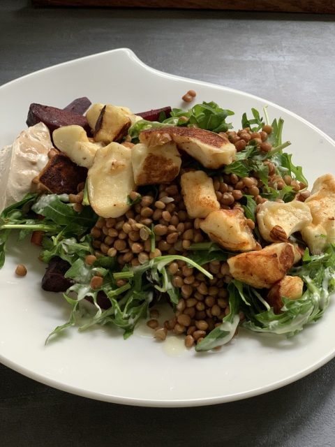 • Zum Anrichten auf dem Teller erst das Gemüse, dann den gewaschenen Salat, darauf das Dressing, dann die Linsen und darauf Haloumi und Walnüsse geben. Wer die Kombi süß/herzhaft mag grillt noch ein paar Apfelspalten an und gibt sie dazu