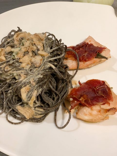 Saltimbocca vom Huhn mit Black Bean Spaghetti