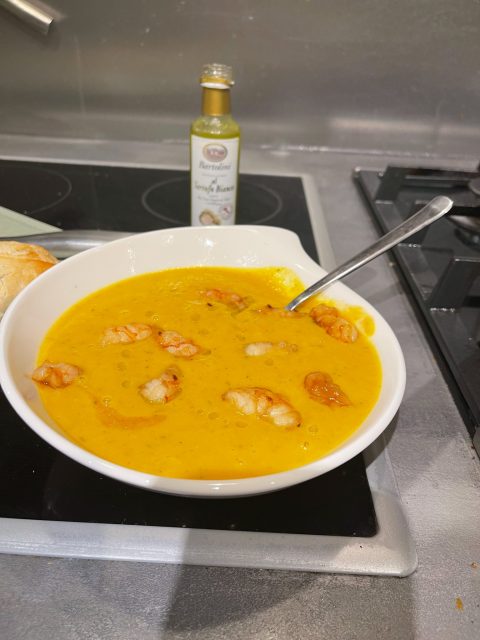 Superschnelle Kürbissuppe mit marinierten Garnelen