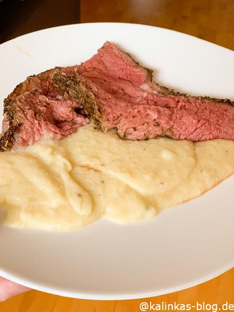 - Das Pürree könnt Ihr auch nur aus Sellerie kochen, das wäre dann richtig low carb. Leider mag meine Familie den Geschmack nicht, so dass ich immer einen kleinen Teil Kartoffeln untermische. Ihr schält Sellerie und Kartoffeln und würfelt alles grob. Mit wenig Wasser 20 min gar kochen, alles muss sehr weich sein. Dann pürieren und die Milch und Butter unterrühren. Mit frisch geriebener Muskatnuss, Salz und Pfeffer gut abwürzen.